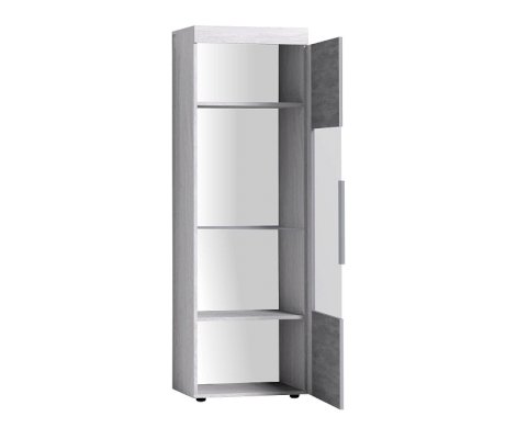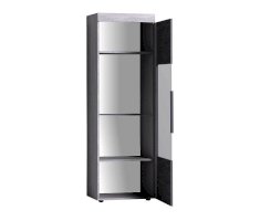 Если вы считаете, что хранить в гостиной посуду уже не модно, шкаф со стеклянной дверцей и стеклянными полками станет отличной витриной для дорогих и любимых фотографий и памятных вещиц. Стеклополки в обработке еврокромкой выдерживают до 10 кг каждая. Их можно декоративно подсветить с помощью светодиодной подсветки (в комплекте не поставляется, приобретается отдельно). Фасад перенавешивается на левую и правую сторону. Серебристая стильная ручка из массива дерева и серое тонирование стекло фасада вносят смелые дизайнерские штрихи в восприятии актуального декора "под бетон".