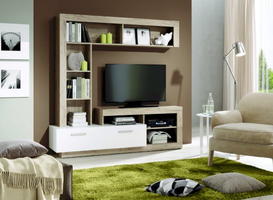 ТВ-тумба с большим выдвижным ящиком и открытыми нишами под мультимедиа превратит гостиную в настоящий домашний кинотеатр. Комбинированный стеллаж с открытой полкой подойдет для книг и предметов декора, способных оживить любой интерьер.
