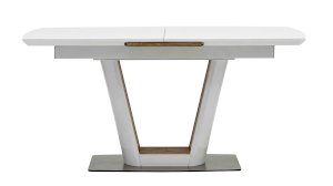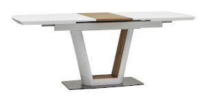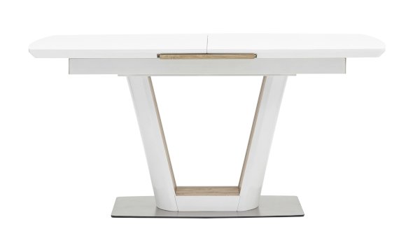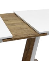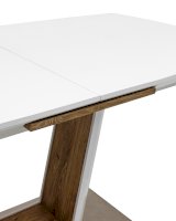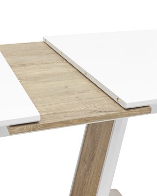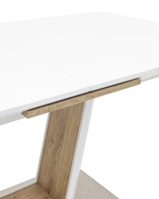 Обеденный стол раскладной. Столешница выполнена из прочного и долговечного МДФ. Столешница и ножка стола выполнены в едином стиле, светлая глянцевая поверхность идеально сочетается с деревянными вставками. Красивая форма стола позволит легко вписать его в современный интерьер, стол украсит кухню, гостиную или современное кафе, ресторан. Дополнительная вкладка стола выполнена из МДФ с бумажным шпоном цвета беленого дуба. На вкладке предусмотрена петля для комфортного открытия стола одной рукой.