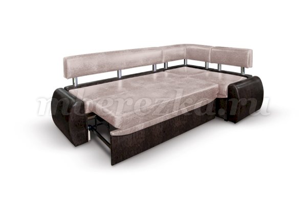 Небольшой раскладной кухонный уголок имеет обтекаемые округлые формы, что актуально для маленьких по площади кухонь. Такая мебель зрительно расширяет пространство, так как в ее дизайне не используются «ограничители» - строгие прямоугольные формы. Мягкость кухонному уголку придает наполнитель пенополиуретан.