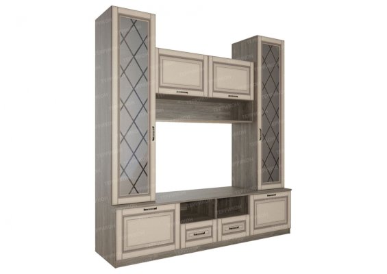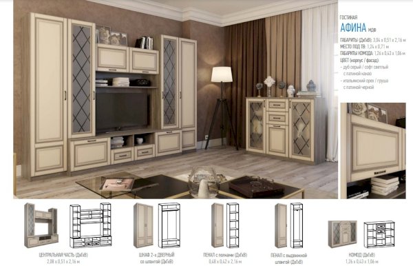 В нежных пастельных тонах выдержана гостиная «Афина». Эта мебель не просто создает уют в комнате, она привносит в атмосферу состояние счастья и благополучия. Ламинированное покрытие под беленный дуб смотрится естественно и респектабельно. Дверцы с декоративными стеклами делают гарнитур изысканным и стильным. Завершающим штрихом к дизайну служат аккуратные, надежные ручки к шкафам, тумбам и ящичкам.