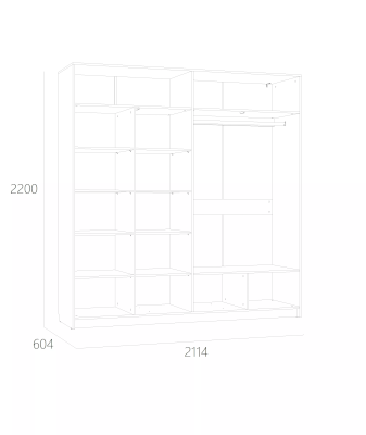 Четырехстворчатый шкаф Summit НМ 011.48 станет достойной альтернативой гардеробной комнате, сэкономит пространство и задаст стиль интерьеру спальни. Внутри модуль разделен на две равные секции. В левой части шкафа находится секция из восьми полок для хранения одежды в сложенном виде. В правой половине модуля установлена штанга для одежды на вешалках плечиках. Зеркальные фасады добавят свет и визуально расширят комнату.