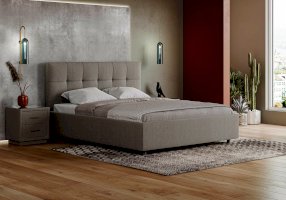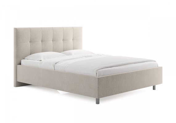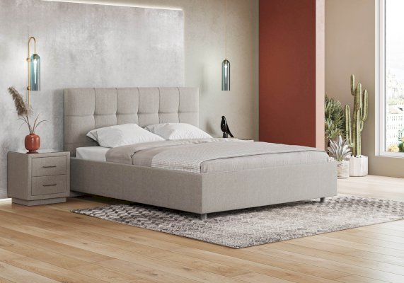 Лаконичная интерьерная кровать с изголовьем, украшенным декоративной строчкой. Модель изготовлена из ДСП. Обратная сторона изголовья обита темно-серым спандбондом, но, при желании, её можно выполнить из основного обивочного материала. В комплект кровати входит кроватное основание. Каркас основания выполнен из металла, ламели - из берёзы. При необходимости в комплект можно включить подъемный механизм с бельевым ящиком, который существенно увеличит объем хранения вещей,  а так же позволит легко производить уборку пыли под кроватью.