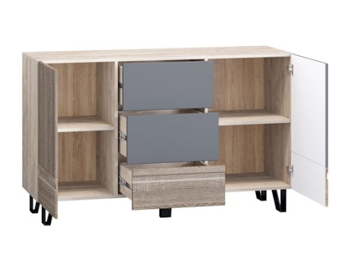 • Содержит три выдвижных ящика и два отдела за распашными дверцами.