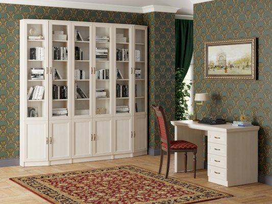 Ручка-скоба выполнена из металла бронзового цвета. Она удобна в использовании и проста в установке. В коллекции 5 модулей, их количество оптимально для создания композиции для кабинета. Кроме того, шкаф можно использовать как самостоятельный модуль в других жилых и офисных помещениях.
